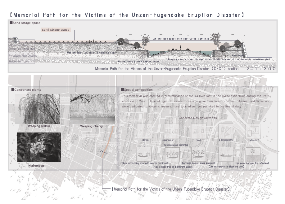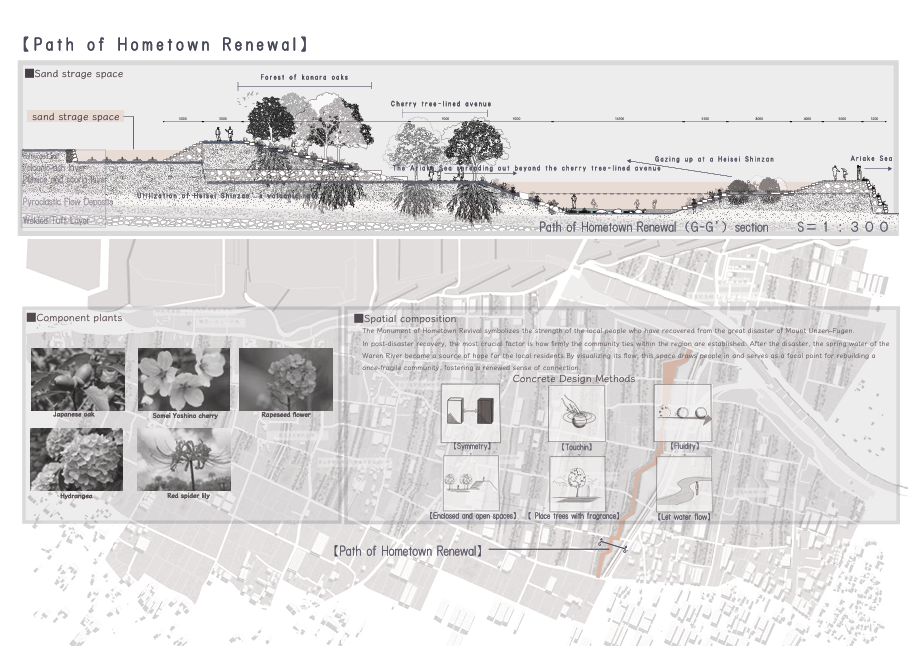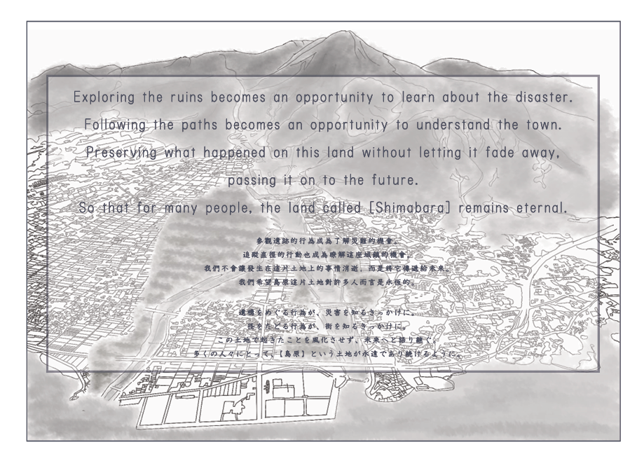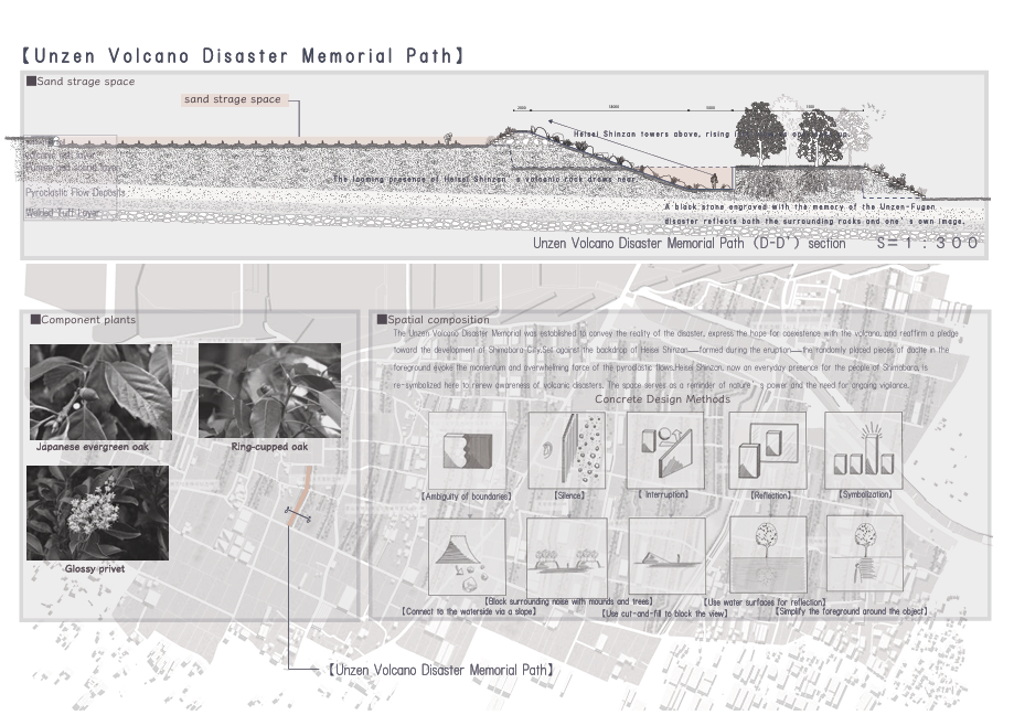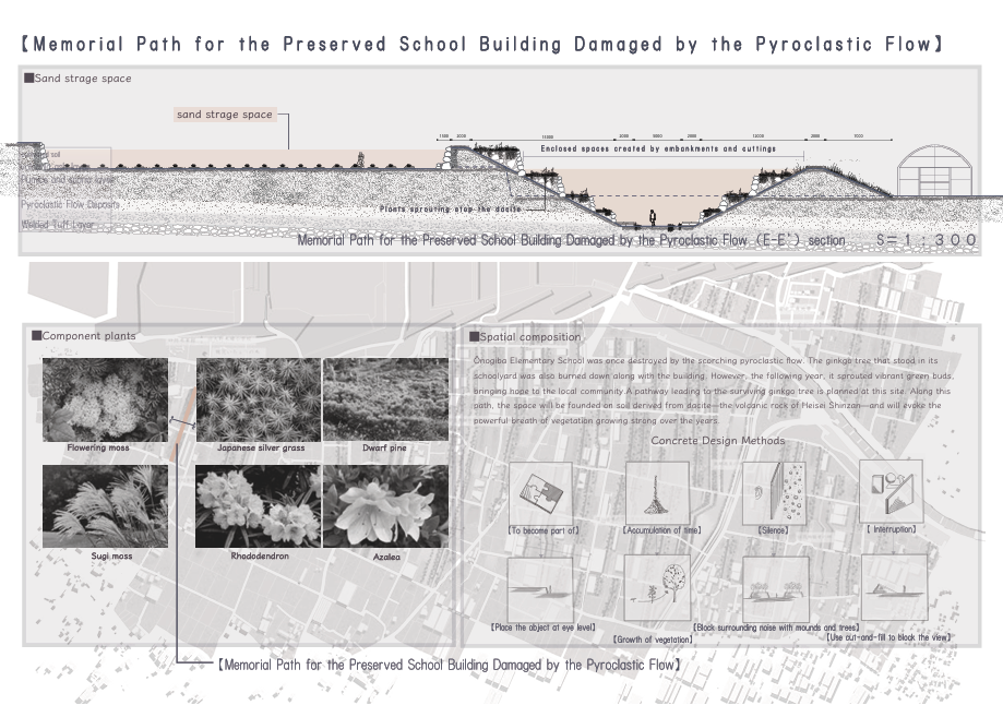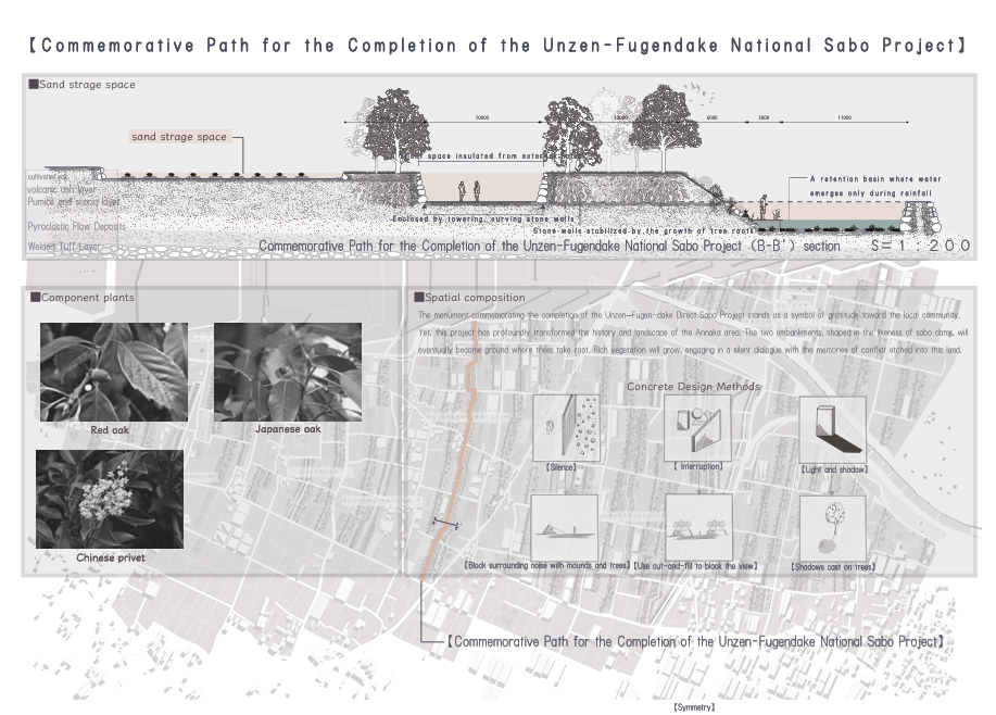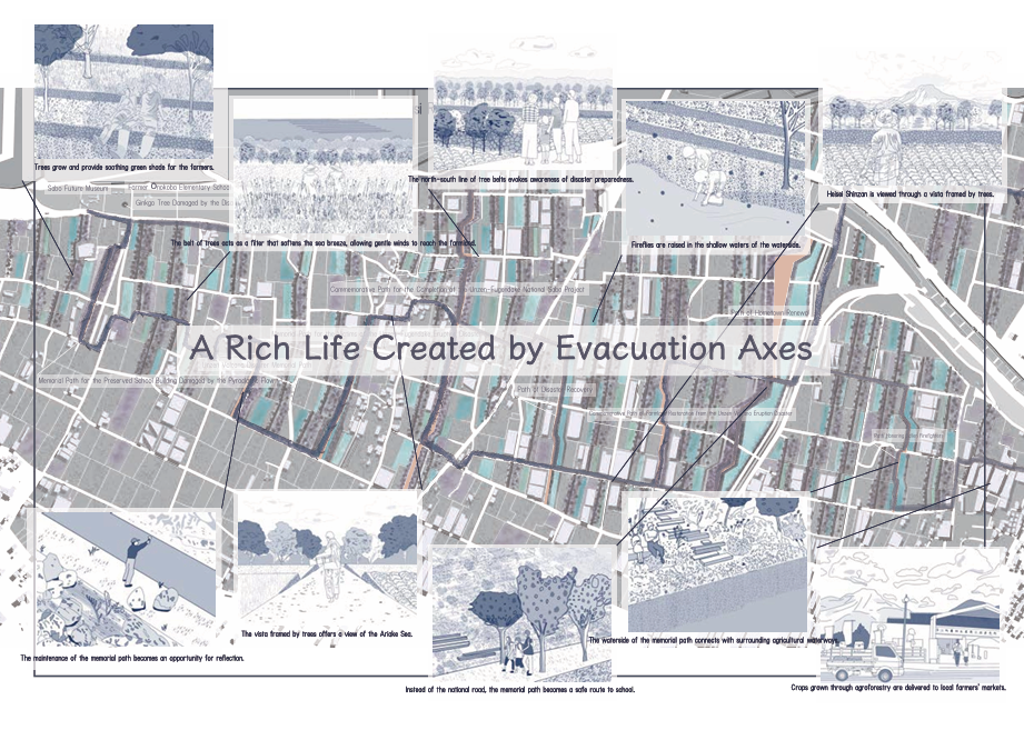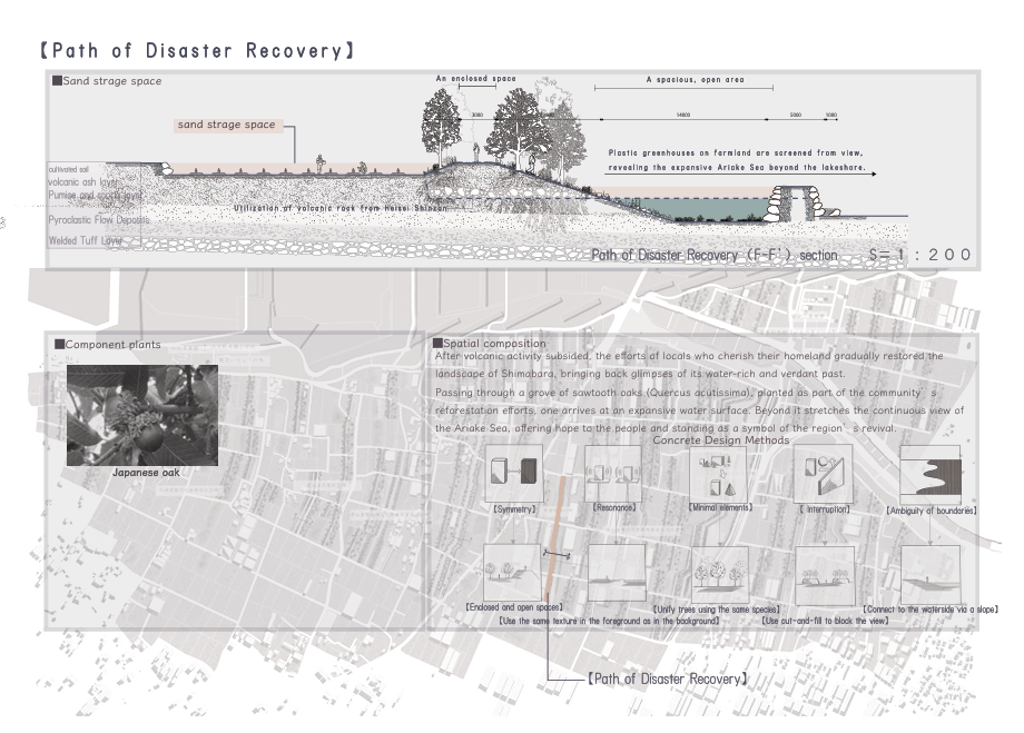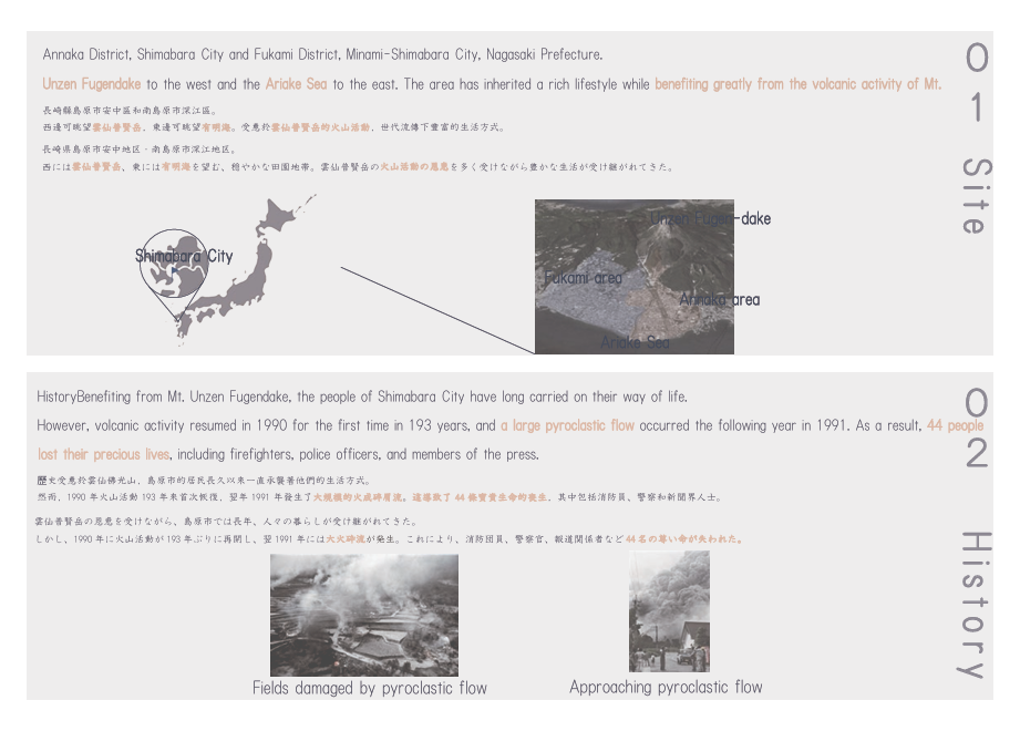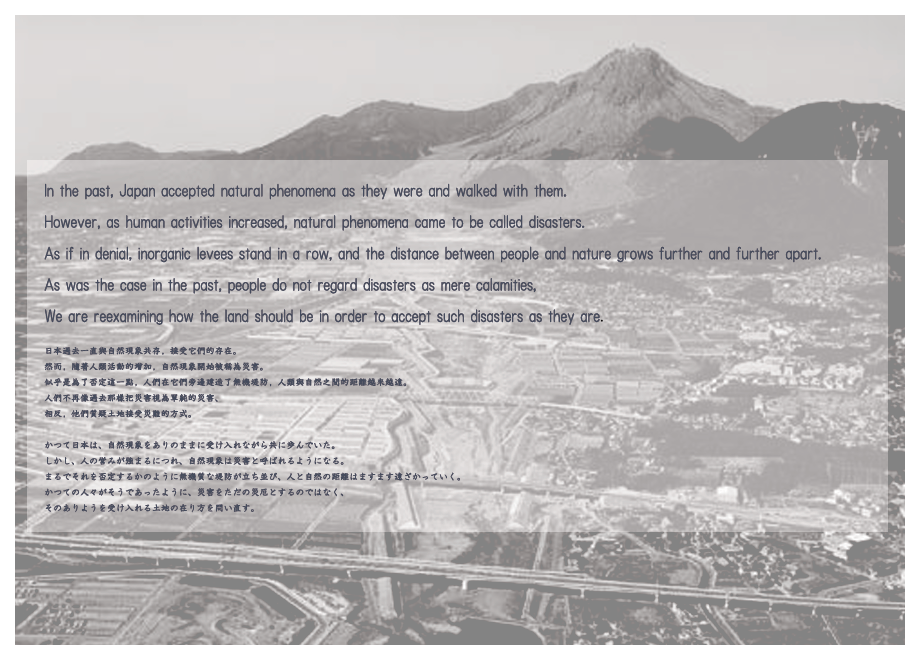 雲仙普賢岳の噴火で被害を受けた島原市には、不安定な溶岩ドーム「平成新山」が残る。分断を生む導流堤に代わり、地域全体で土砂を受け止める土地のあり方を模索する。田畑に【切り土】【盛り土】を施し、災害とともに生きる安中地区の未来を描く。