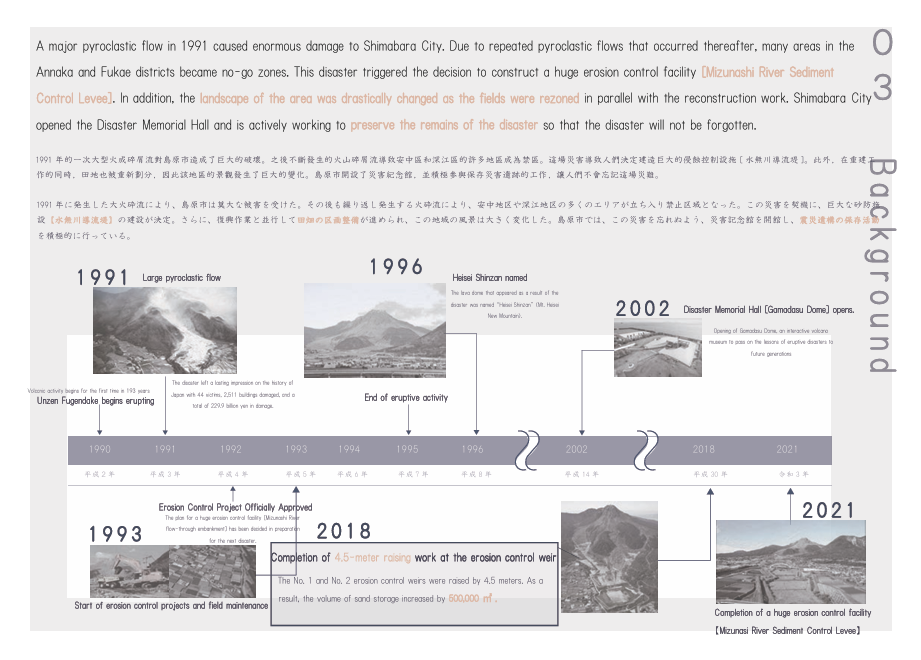 長崎縣島原市因雲仙普賢岳的噴發蒙受重創,至今仍有不穩定的熔岩穹丘「平成新山」矗立於當地。為防範後續災害所興建的水無川導流堤,卻在空間上造成了地區的分斷。