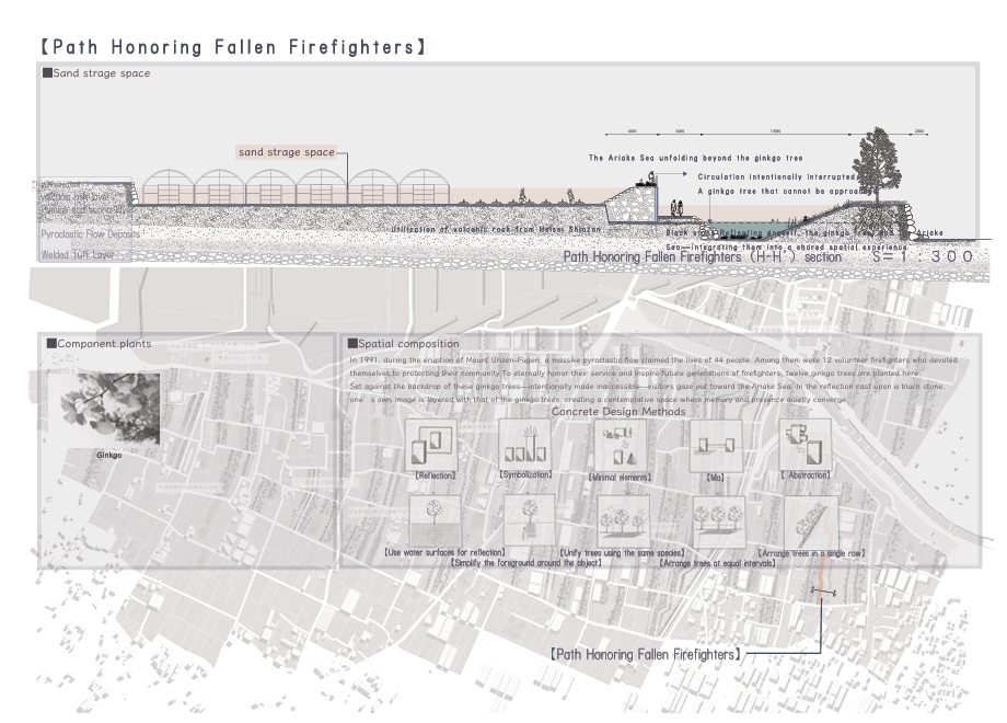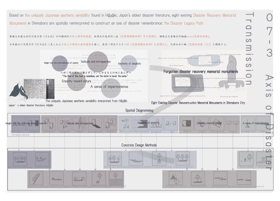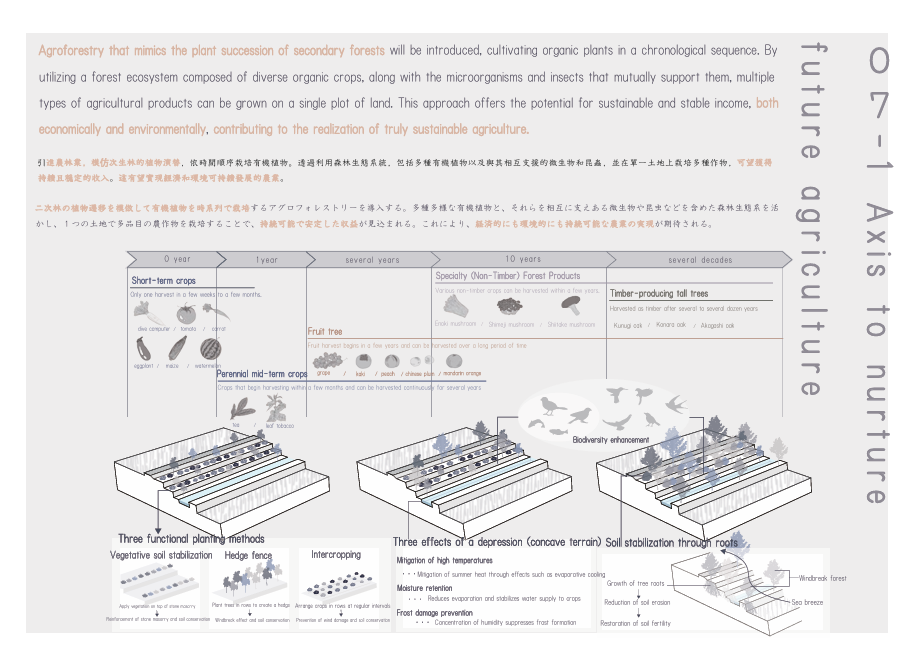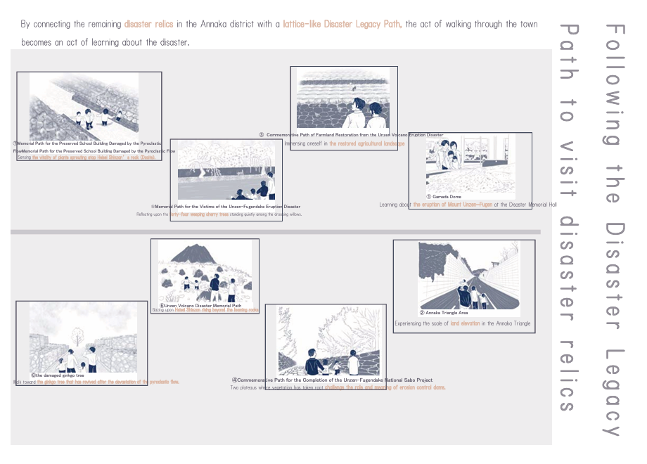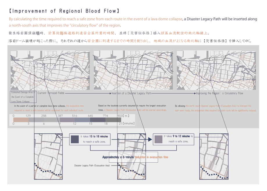 Shimabara City in Nagasaki Prefecture suffered devastating damage from the eruption of Mount Unzen-Fugen, and the lava dome “Heisei Shinzan” remains unstable today. The Mizunashigawa River Sediment Control Levee, built in preparation for future disasters, now divides the district. Rather than simply raising levees, could the land itself be shaped to receive and absorb sediment across the entire region? By applying cut and fill techniques to existing farmland, we envision a future for the Annaka area that faces disasters head-on. This is a vision of a landscape that does not treat the collapse of Heisei Shinzan as disaster, but embraces it as part of the land.