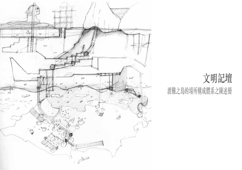 以太平洋沉沒的姆大陸傳說為起點,設計尋徑至日本西端邊境的與那國島。島民獨有的農漁產業與祭典儀式編織成日常生活,逐步形塑出自成一格的構築語系。以「生活文明」為脈絡,探討島嶼與失落大陸之間的潛在連結,鋪陳一種未來考古的伏筆。
