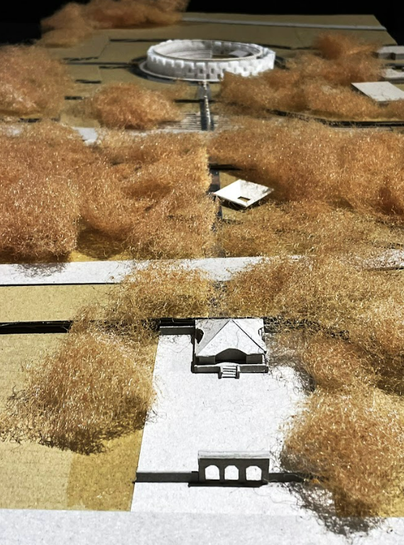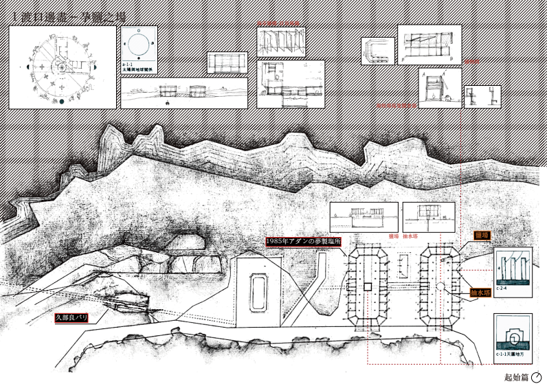 The journey begins at Kubura Port, where a former salt field is reimagined as the “Salt Birth Ground,” using wind-responsive walls to create illusions between land and sea. Moving inland, a hill in the island’s central village becomes the “Purification Assembly,” a hybrid of bathhouse and theater that invites ritual cleansing and reflection. Further south, in Sonai Village, the “Pastoral Tomb” links bullring and graveyard through an underground passage, where rainwater and glass blur the boundary between life and death. The path ends at the island’s submerged ruins, transformed into the “Maritime Ritual Grounds,” where glimmers of fishing fire reflect off copper surfaces and awaken collective memory.