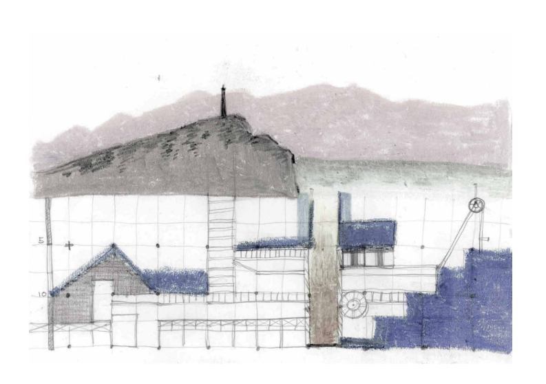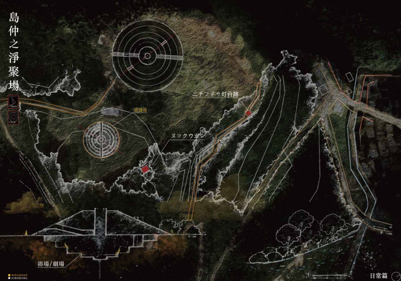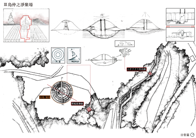 中繼於島中央舊聚落島仲村,是祭儀匯集的信仰中心。「淨聚場」設於既有土丘內,導入泡澡文化,融合浴場與劇場機能,以水為媒介,洗滌身心、映照日常。