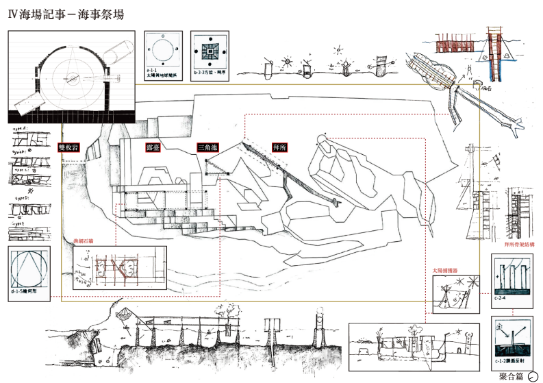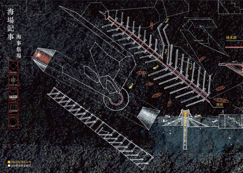 最終來到島嶼南側海底的古文明遺址,轉化為「海事祭場」。於傍晚時分,捕魚火光映照於銅面,微光灑落海面,如喚醒沉沒記憶般啟動產業儀式,將過去拜所幻化為未來可被閱讀的事件場域。