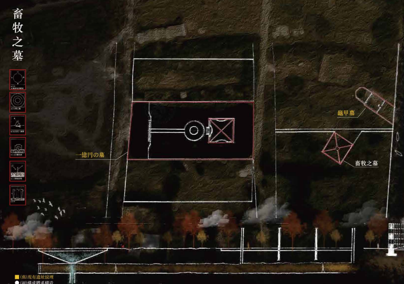 其下的祖那村擁有鬥牛場與墓地群,設計於其間構築「畜牧之墓」,地底通道連接生死兩端,以霧玻璃圍牆與雨水作用呈現人與自然的消融與融合,並引島上祭儀河川灌沐此場域。