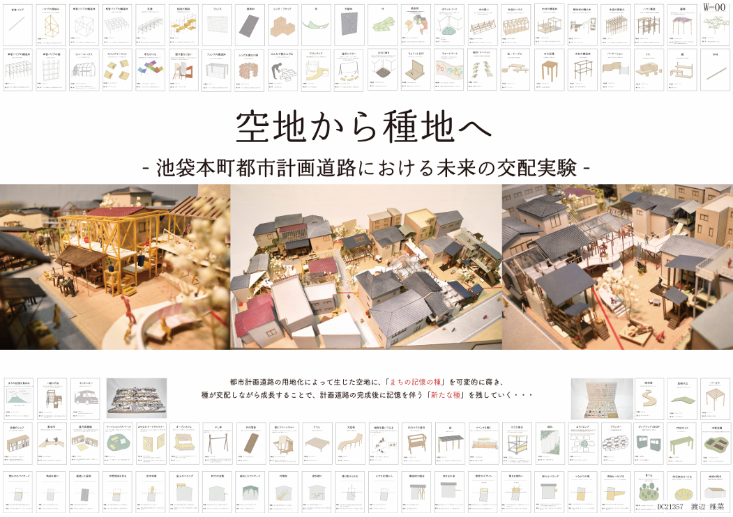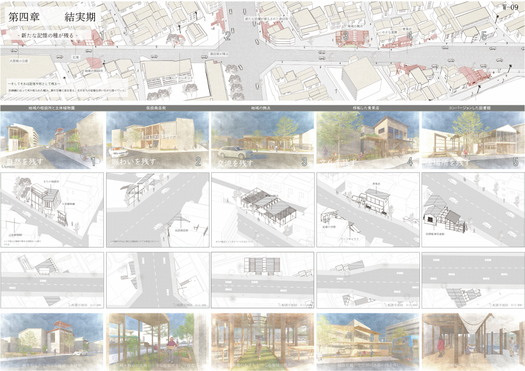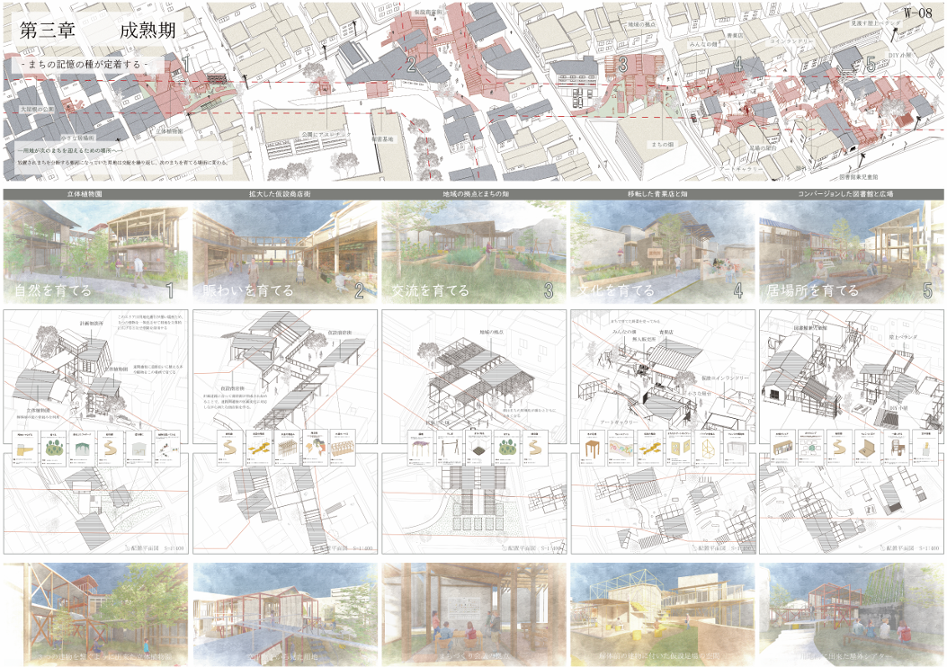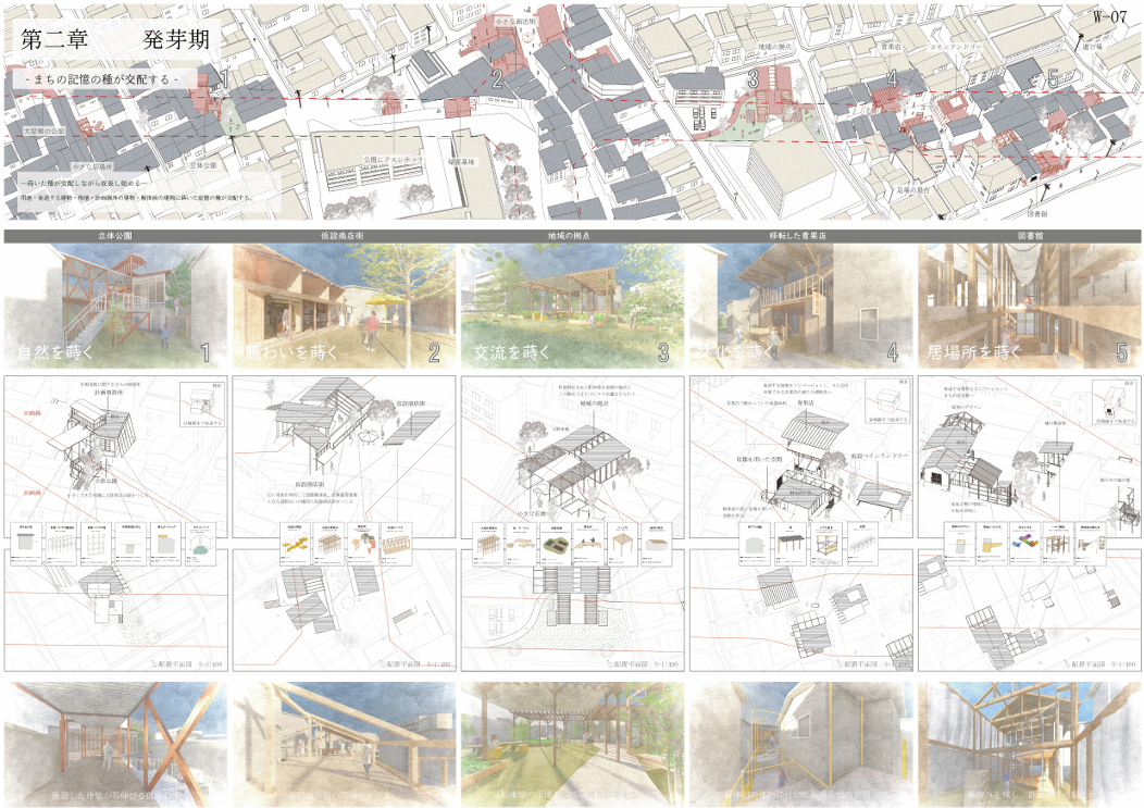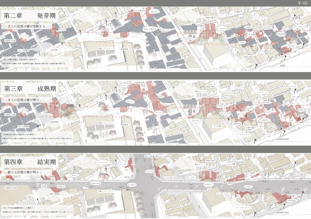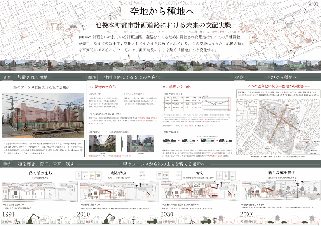都市計画道路による空地を「種地」と捉え、地域の記憶を「記憶の種」として蒔き交配させることで、未来の居場所を育てる提案です。物語や風景を引き継ぎながら、地域とともにまちを再生する新たな都市計画のあり方を示します。
