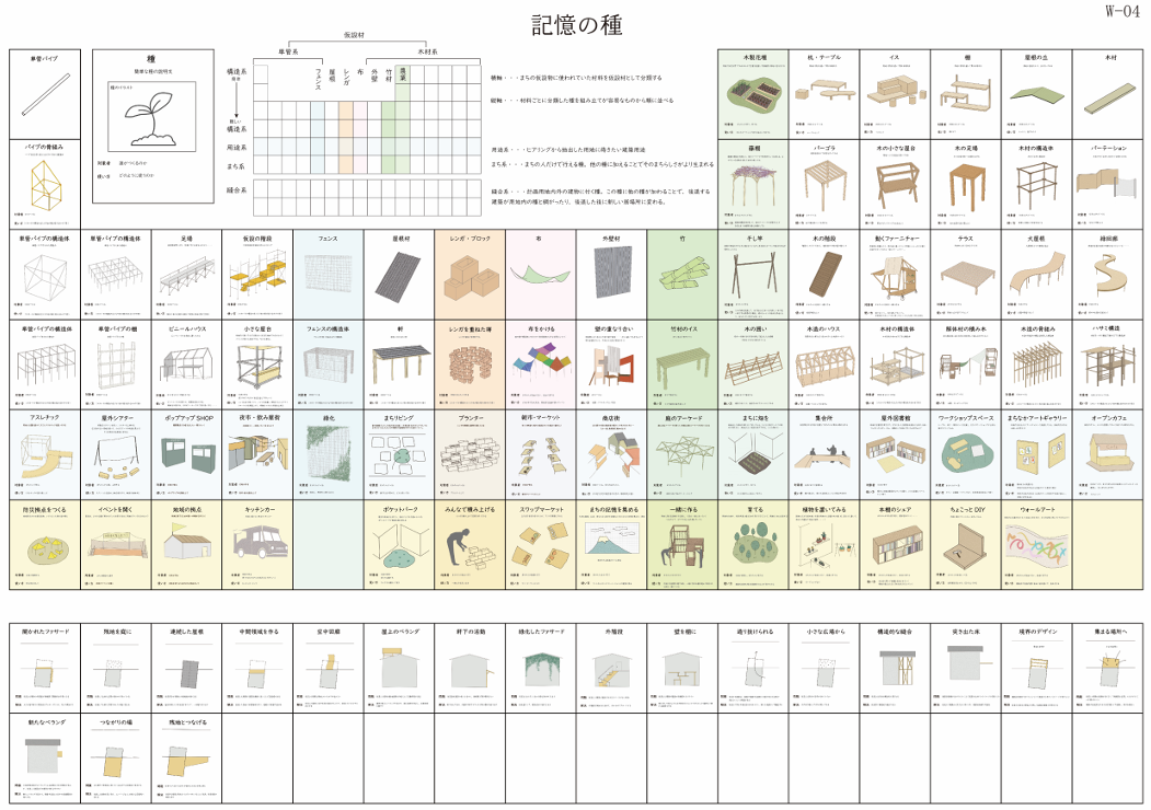 本提案將因都市計畫道路而產生的空地視為「種地」,並把地區的記憶當作「記憶之種」播下並進行交配,藉此孕育未來的棲居場所。透過延續在地的故事與風景,提出一種與地方共生、共同再生的全新都市計畫模式。