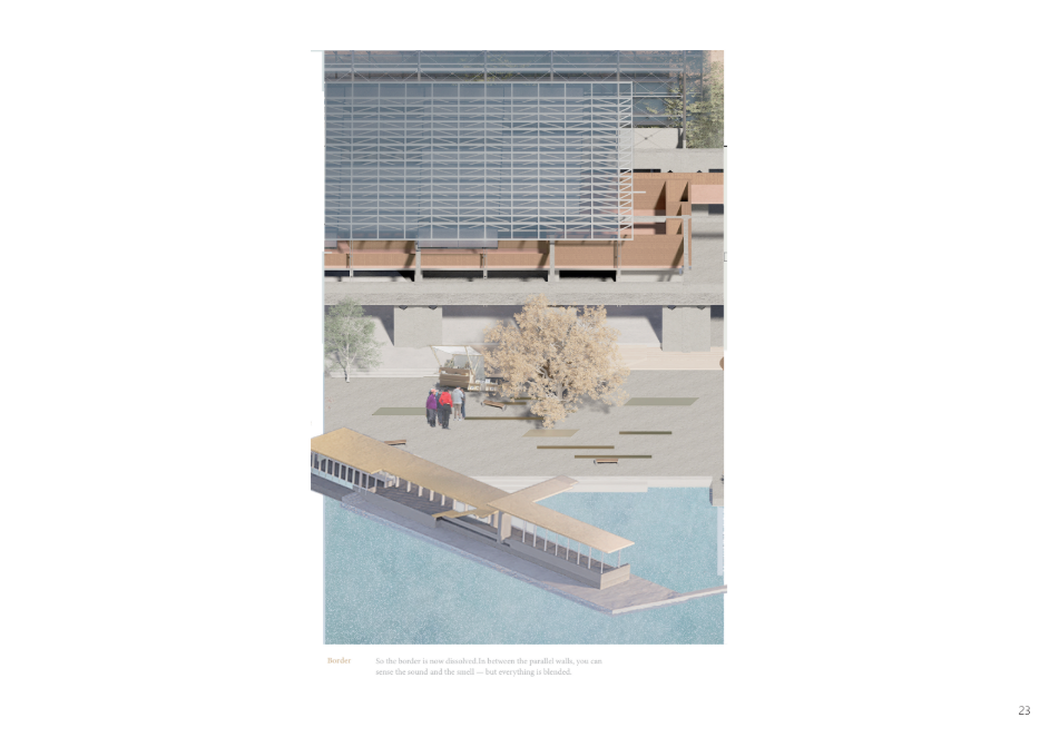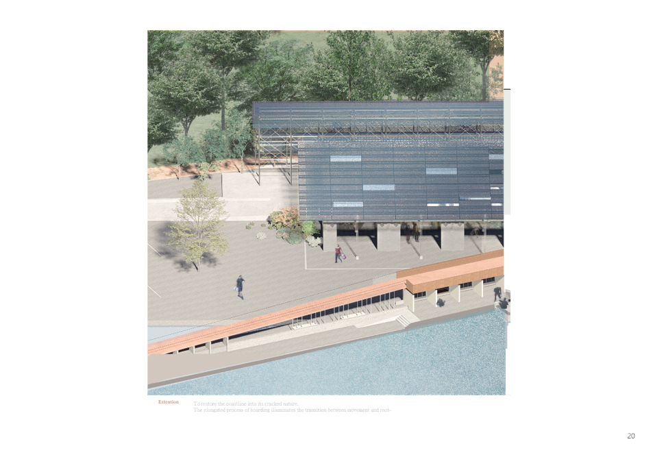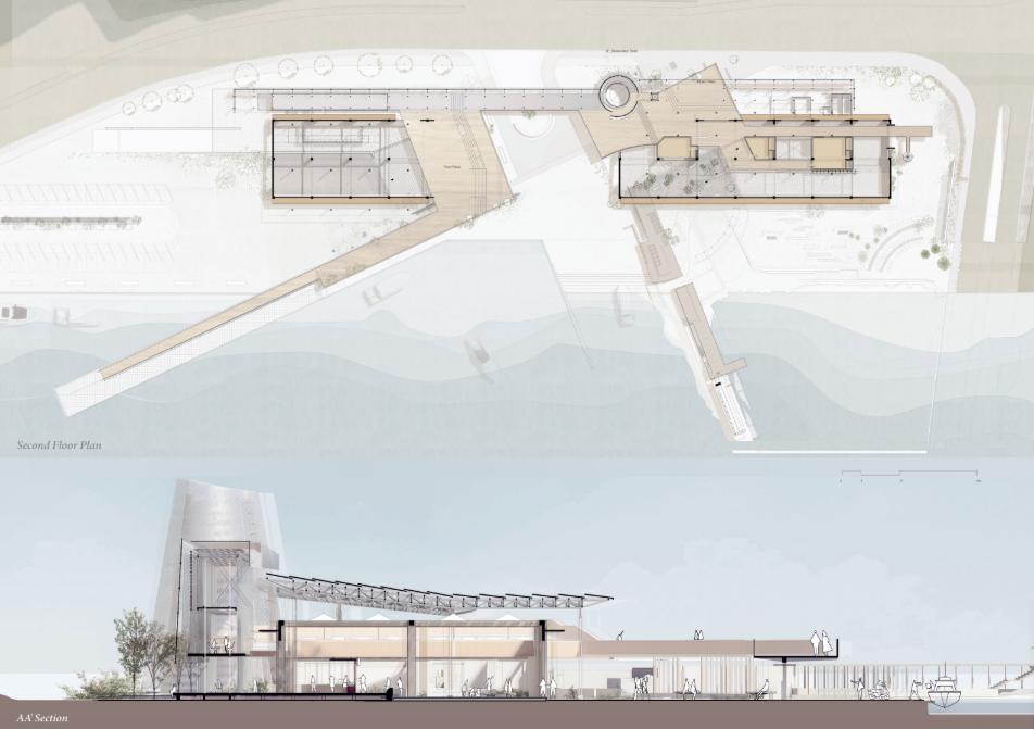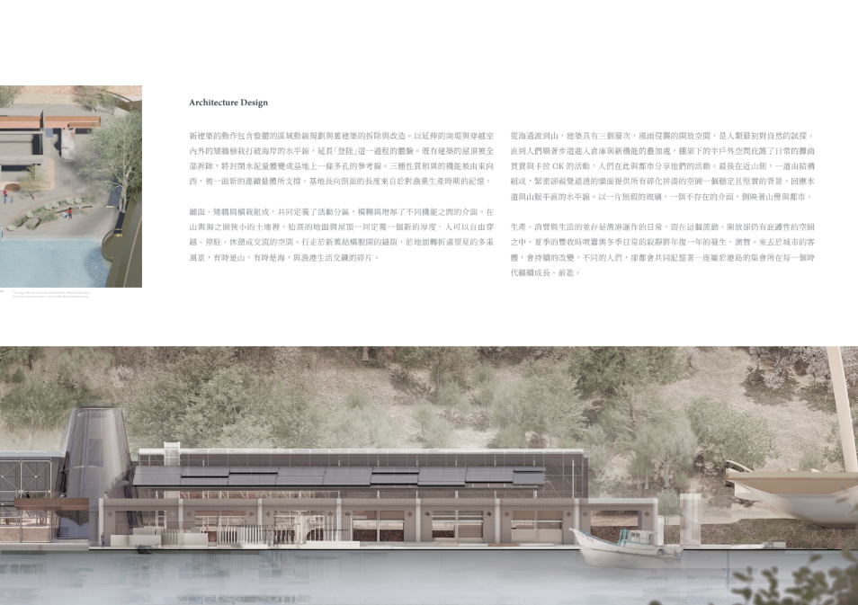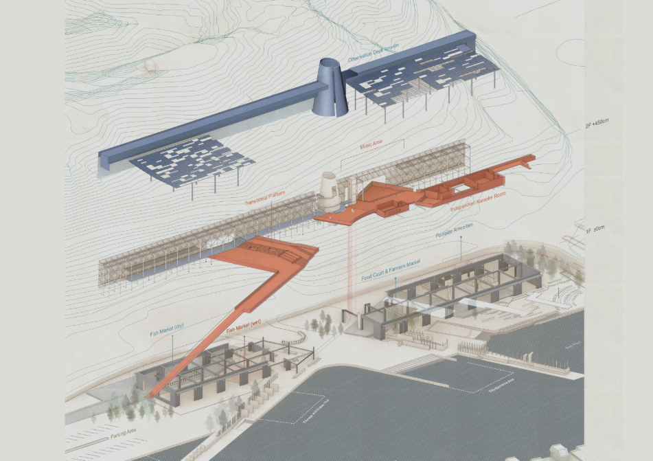 The story of the land unfolds through the daily lives of people and industry. As cities continuously reshape themselves to embrace international migration and activity, this project begins with the transformation of an existing pier warehouse. Through landscape and architecture, it breaks down the barrier between the industrial waterfront and the city. In the dialogue between old and new structures, a shared space emerges for diverse communities—shaped with minimal architectural interference, yet resonating with the coexistence of mountain and sea through shells and openings.