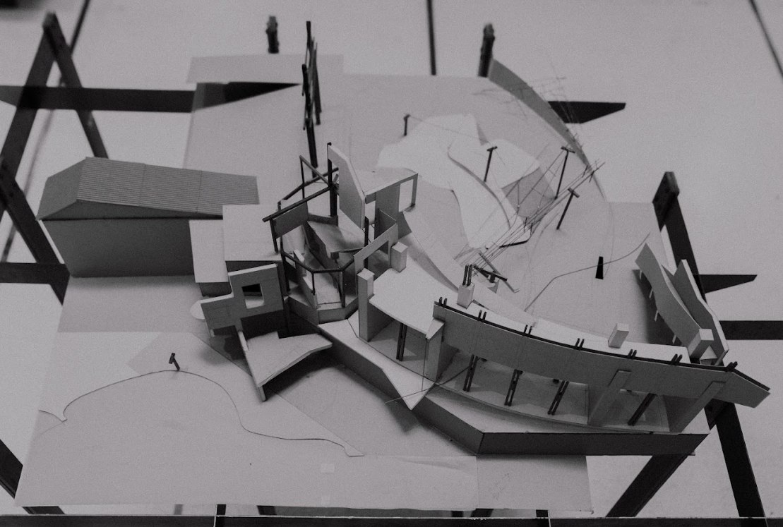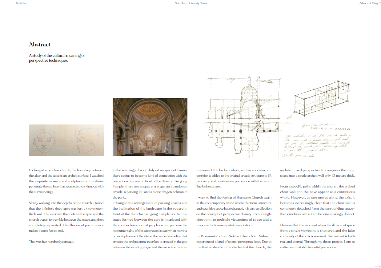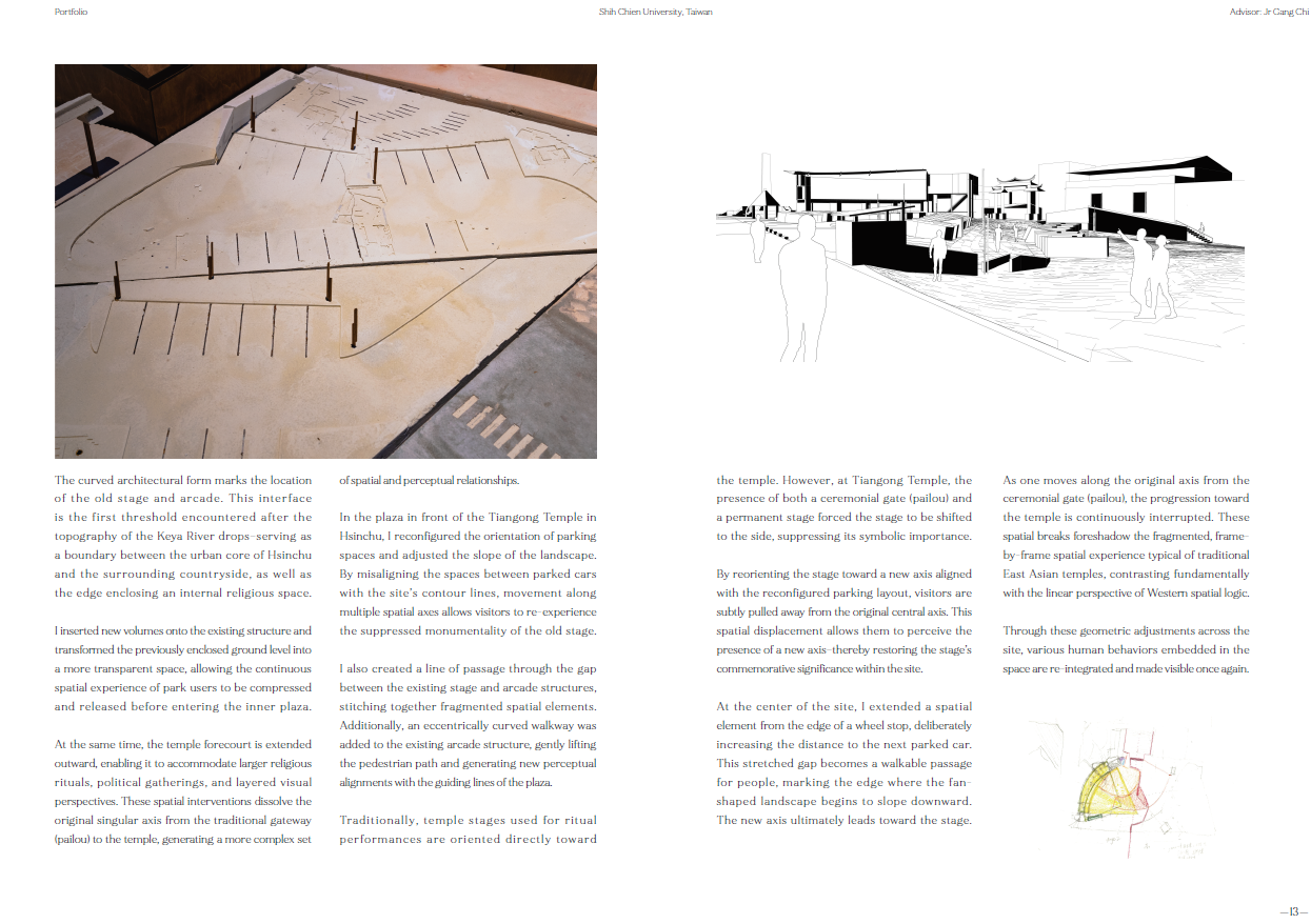 在新竹天公壇前廣場,從下層地面的軸線轉向和地景傾斜;中層構造物形成的場域和感知的邊界;到上層偏心弧形廊道和戲台定義廣場介面的建築體,共同建構抽象空間。同時讓被壓抑的戲台重新得到紀念性,以及讓原先廢棄的拱廊結構透明的串連旁邊公園和各種在地活動。是對於透視法的批判、探索西方單一視點空間以及台灣都市涵構之間的永恆與變動,也是想試圖找回當初於Siena的感動。