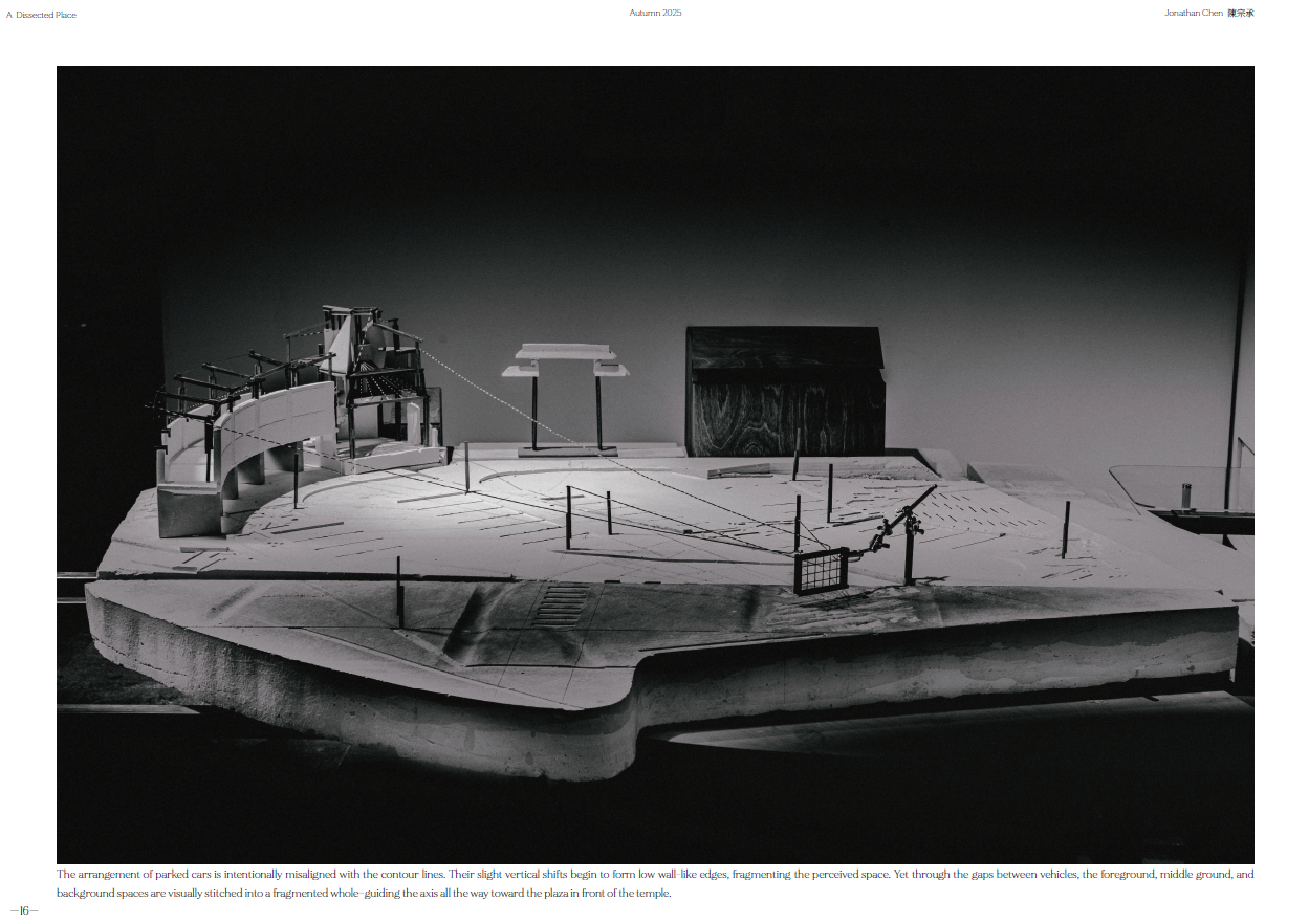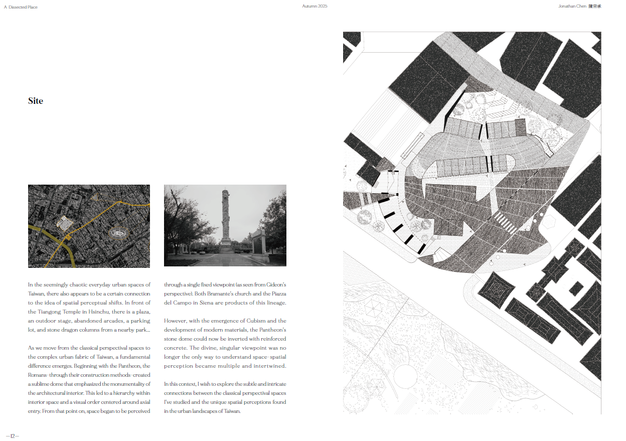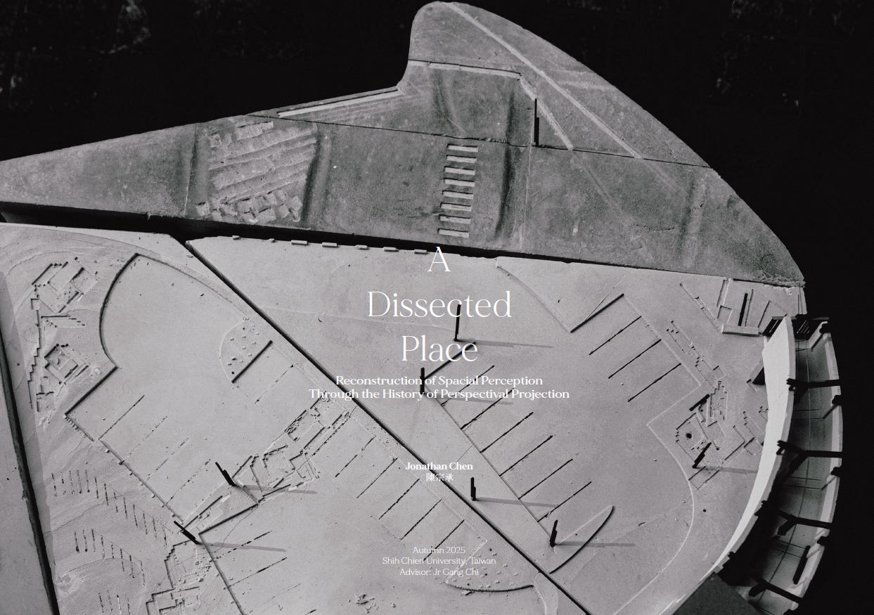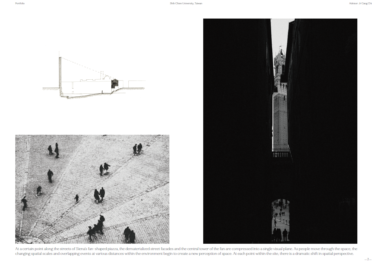 Now, through the perspective machine and my movement in Siena, I map fleeting moments where depth projects invisible structures—where reality and imagination overlap.At Hsinchu’s Tiangong Temple plaza, sloped ground, tilted axes, and fragmented architecture shape a new spatial language. The forgotten stage returns; the colonnade reconnects with life.This is a reflection on linear perspective—a reconsideration of Western spatial vision and the shifting fabric of Taiwanese urbanism, in search of the emotion I once felt in Siena.