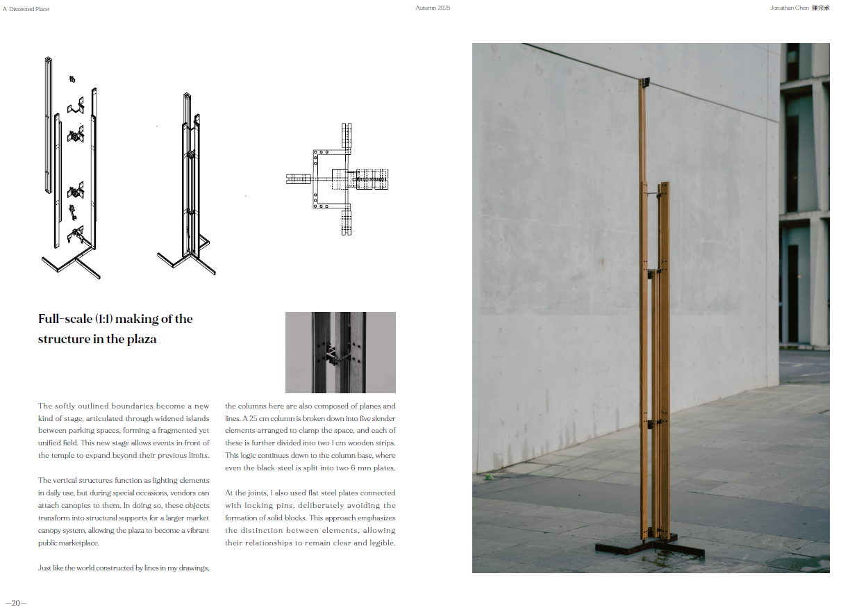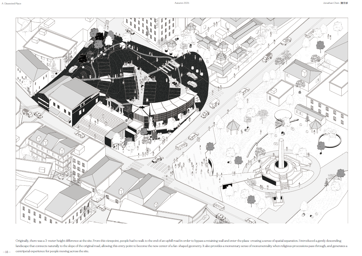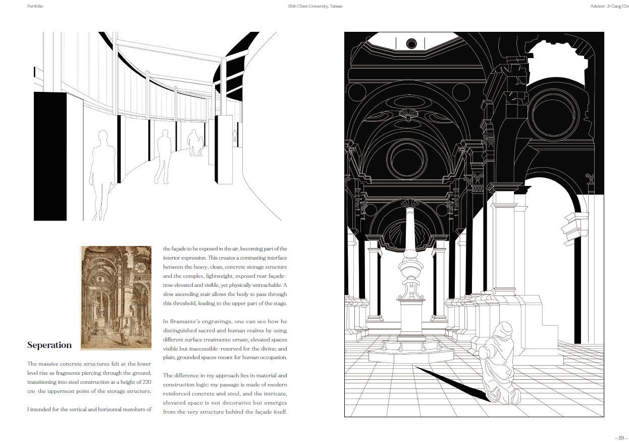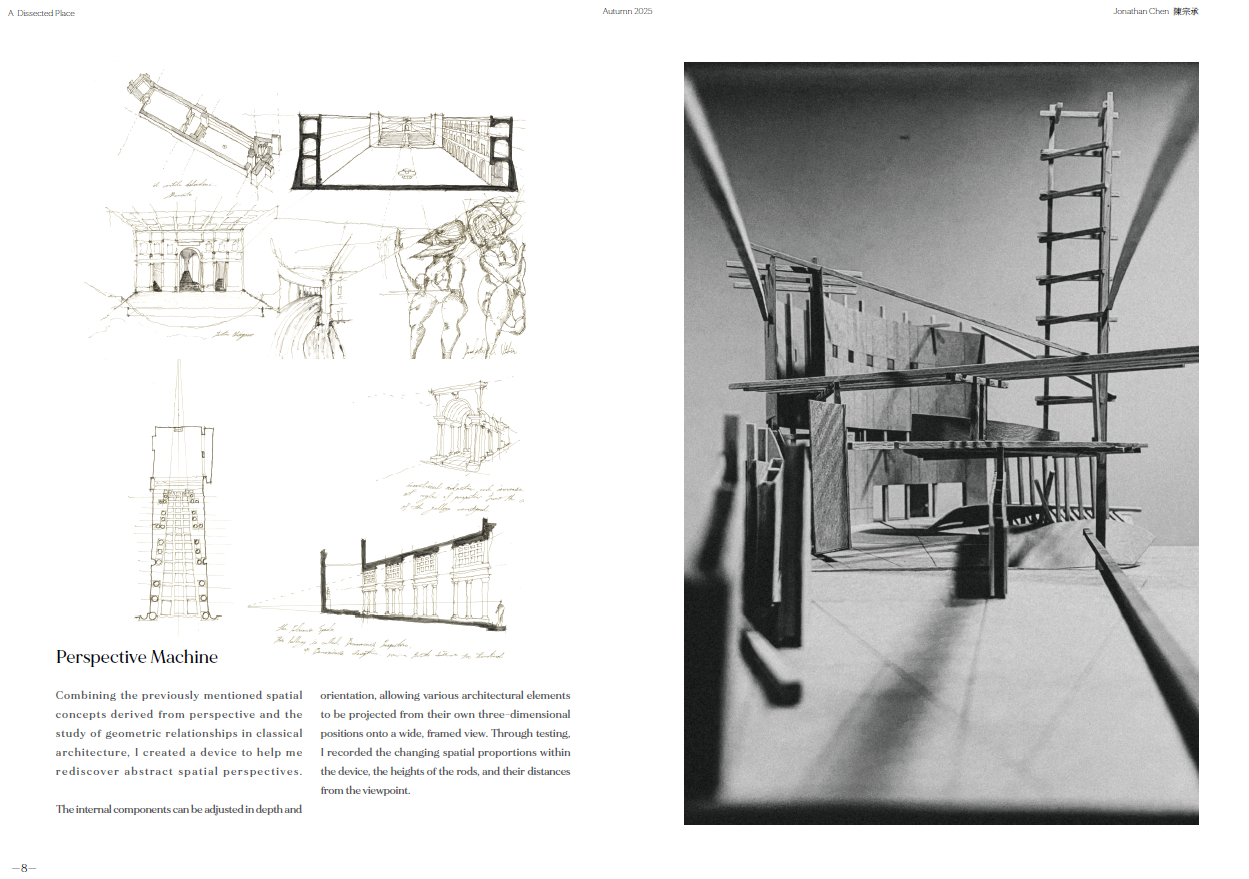 Now, through the perspective machine and my movement in Siena, I map fleeting moments where depth projects invisible structures—where reality and imagination overlap.At Hsinchu’s Tiangong Temple plaza, sloped ground, tilted axes, and fragmented architecture shape a new spatial language. The forgotten stage returns; the colonnade reconnects with life.This is a reflection on linear perspective—a reconsideration of Western spatial vision and the shifting fabric of Taiwanese urbanism, in search of the emotion I once felt in Siena.