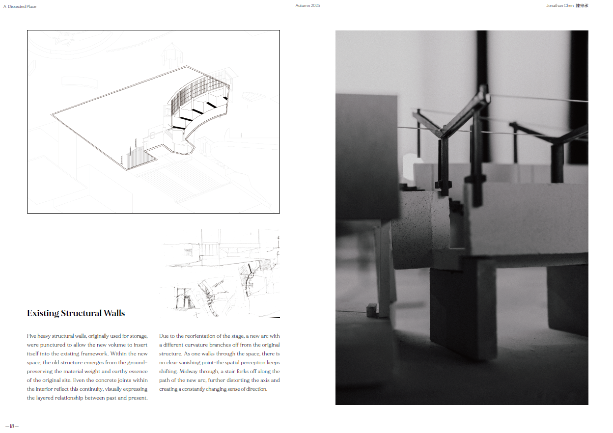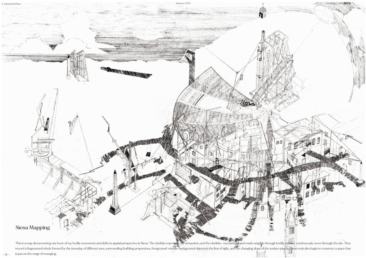 現在,我先透過透視機器製作以及身體於Siena山城中移動產生的透視變化所繪製的感知地圖,來研究不同深度的資訊投影於人感知到空間的瞬間切面上所形成的不可視空間結構,一個真實與想像共存的空間。再將這樣的空間概念表達於看似紛亂的台灣日常都市空間。