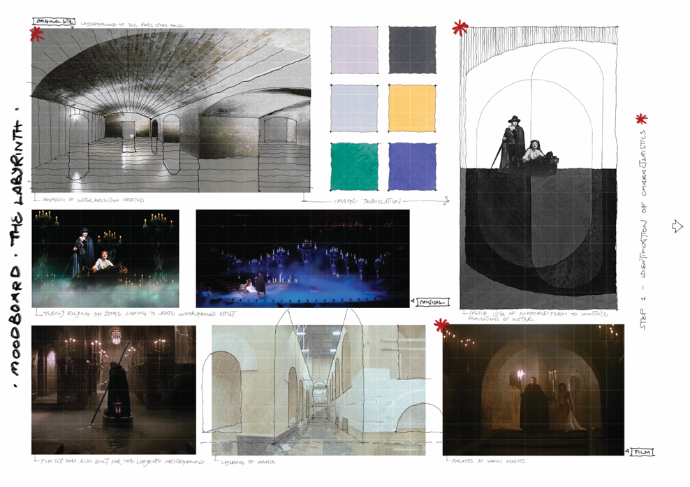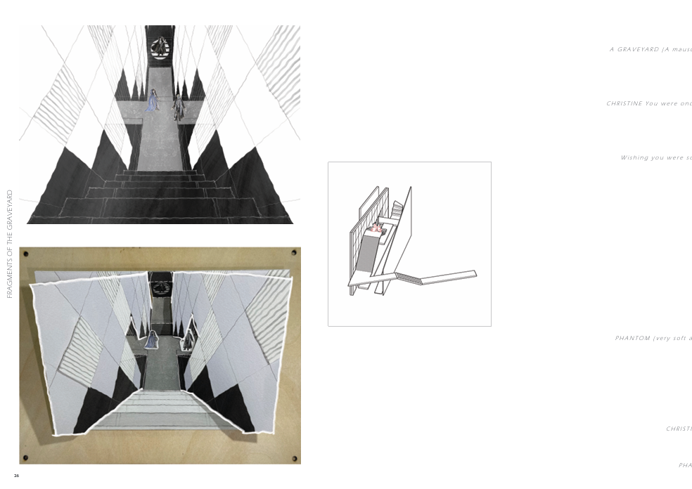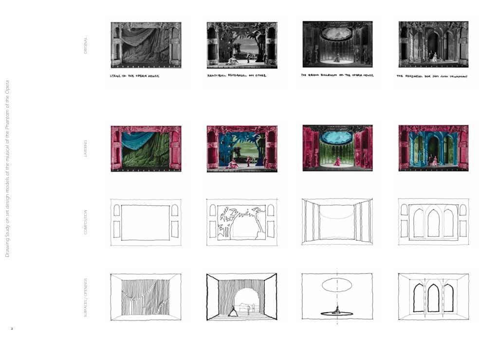 Theatre spaces reveal themselves as a space composed of thresholds and framed views. Theatregoers spend most of the time in the auditorium, experiencing the entire journey from a fixed perspective. This typical theatre setting limits the interaction between theatregoers, performers, and the designed space. This project explores the potential of perspective drawings, a methodology-driven study that encourages intuitive and active participation in image creation that influences human experience within a theatre space. Through studying set designs of Giuseppe Galli Bibiena, a methodology was developed through dissecting his perspective drawings. Attaching myself to one of the classics: The Phantom of the Opera, this methodology was applied to design spaces by reversing the process of the study. Each drawing developed from silhouettes of openings and surfaces is then collaged in sequence as a guide, shaping an immersive performance environment that exhibits a continuous sequential and participatory theatre-going experience. The architecture of theatre has historically been characterised by its ability to frame narratives through spatial and visual constructs. Traditional proscenium stages, defined by fixed sightlines and rigid geometries, have conditioned audiences to engage with performances primarily as passive observers rather than as active participants. This project aims to interrogate the conventional theatre experience by reimagining set design through the framework of perspective drawing—a methodology that not only shapes spatial arrangements but also influences perception and engagement. In traditional theatre practice, the architect is responsible for designing the structural container (the building), while the scenographer focuses on the content (the stage). This project seeks to dissolve that division by allowing the architectural qualities of scenic drawings to exert a designed influence on theatre spaces, thereby positioning architecture itself as a form of scenography.