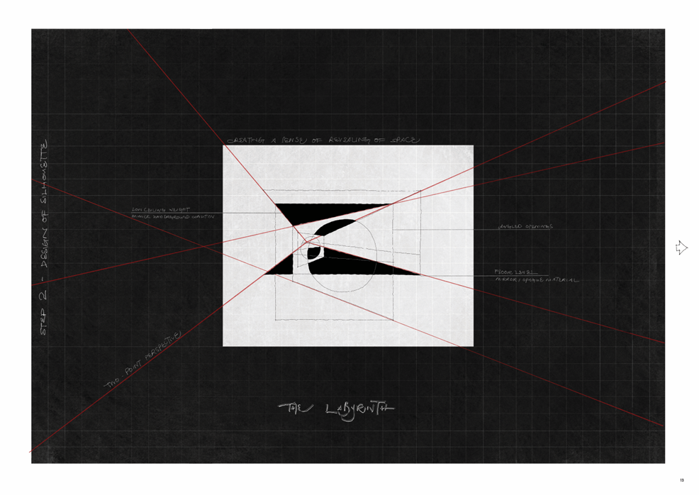 透過對巴洛克舞台設計師朱塞佩・加利・比比納(Giuseppe Galli Bibiena)舞台設計的研究,本論文發展出一套透視法的方法論。透過解析比比納的透視圖,並以經典作品《歌劇魅影》作為實驗對象,反向運用所建立的方法來進行空間設計。每張圖像由開口與表面輪廓的剪影構成,並依序拼貼,形成引導性的敘事路徑,構建出連續而沉浸的表演環境,重新定義了觀眾參與劇場的經驗。