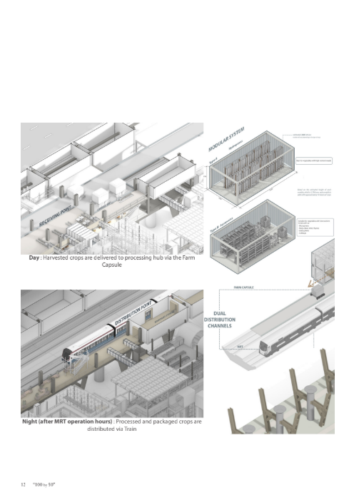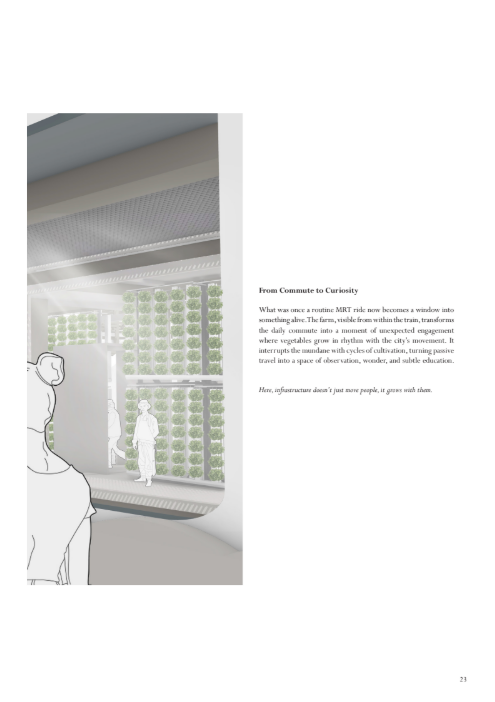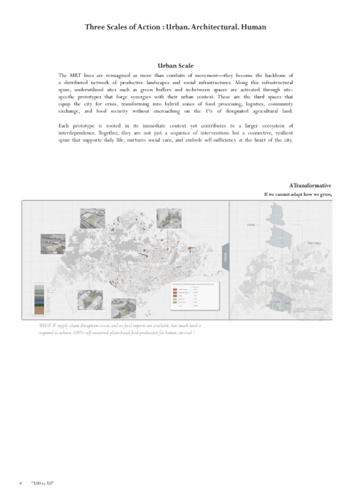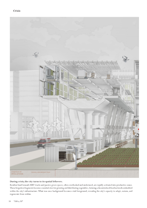 Singapore, celebratedfor its global connectivity and rapid urbanization, relies on imports for over 90% of its food, leaving its security vulnerable to geopolitical instability, climate change, and global supply chain disruptions. This research reimagines Singapore’s agricultural landscape, shifting it from a peripheral concern to a vital force that shapes both its physical environment and societal fabric. Central to this vision is transformability—dynamic urban farming systems designed to scale and shift focus fluidly between crisis and non-crisis scenarios.