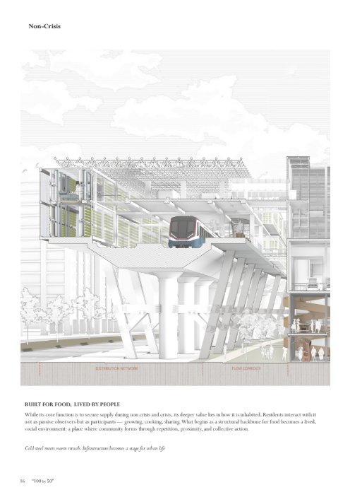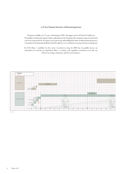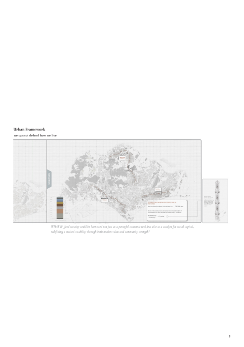 The thesis presents a roadmap for achieving 100% self-sustained vegetable production by 2050. It calls for a radical reimagining of urban architecture, where food security is seamlessly woven into every layer of the built environment as an integral part of the city’s infrastructure. In a world where food insecurity increasingly mirrors geopolitical risks, this thesis posits a claim: true national security is rooted in the soil beneath our feet—in a nation’s capacity to feed its people from within.